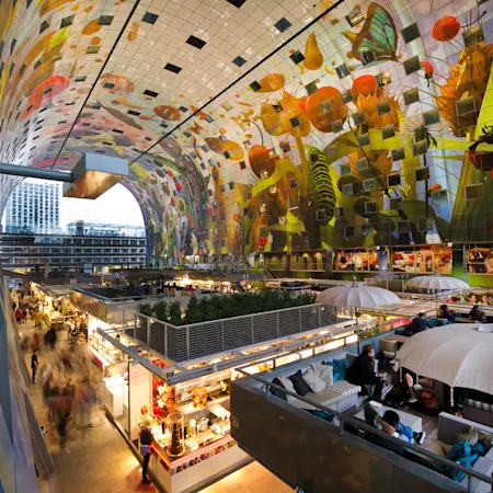 Beneath the striking architecture of Rotterdam's Markthal lies an equally impressive feat of engineering: the city's largest car park, providing 1,066 convenient spaces. Since its opening in 2014, the Markthal itself has become a new icon for Rotterdam, blending a vibrant covered market with shops, offices, and apartments. Its immense arch, adorned with Arno Coenen's 11,000 m² of shimmering floral motifs, is renowned as one of the world's largest artworks, leading some to call it Rotterdam's "Sistine Chapel."