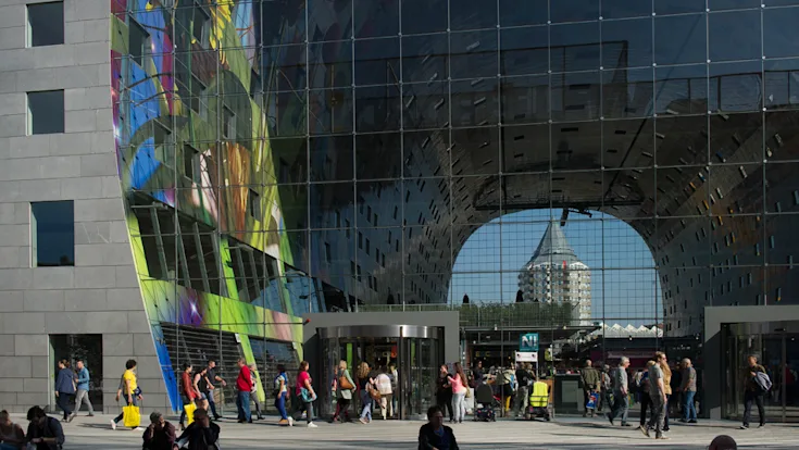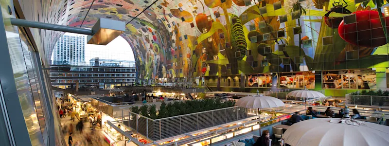 Dal 2014, anno della sua apertura, il Markthal è diventato una nuova icona di Rotterdam, combinando un vivace mercato coperto con negozi, uffici e appartamenti. Il suo immenso arco, decorato con 11.000 m² di motivi floreali scintillanti realizzati da Arno Coenen, è considerato una delle opere d’arte più grandi al mondo, tanto da essere soprannominato da alcuni la “Cappella Sistina di Rotterdam”.